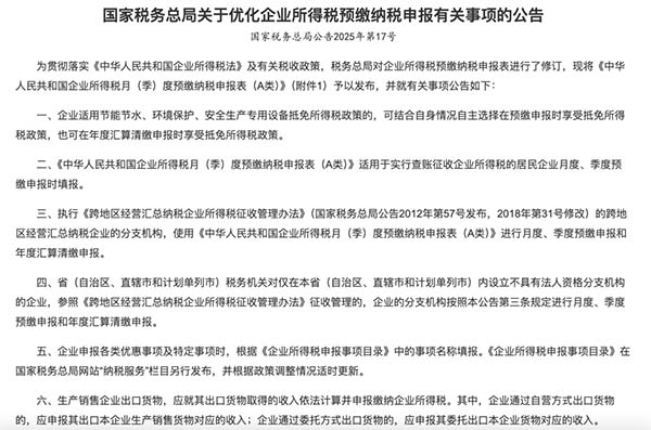 近期,國(guó)家稅務(wù)總局發(fā)布的《關(guān)于優(yōu)化企業(yè)所得稅預(yù)繳納稅申報(bào)有關(guān)事項(xiàng)的公告》(國(guó)家稅務(wù)總局公告 2025 年第 17 號(hào)),則為小微企業(yè)帶來(lái)了諸多利好。