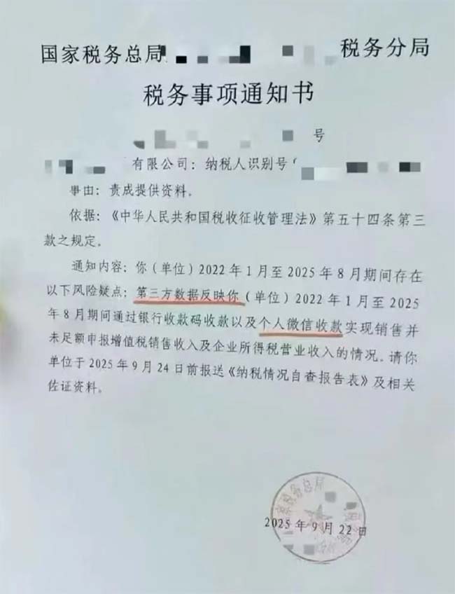 經(jīng)查,該公司于2021年至2023年4月30日通過(guò)1325372XXXX、1813755XXXX、1753740XXXX、1355490XXXX等24個(gè)私人微信賬號(hào)收取公司相關(guān)貨款,稅務(wù)局責(zé)成該公司提供通過(guò)以上微信賬戶收款的相關(guān)貨款審計(jì)的出庫(kù)單據(jù)、銀行收款證明及相關(guān)賬冊(cè)資料。